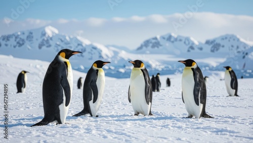 Fototapeta premium Majestic emperor penguins gather in a snowy landscape with stunning glacial mountains in the Antarctic wilderness on a bright sunny day.