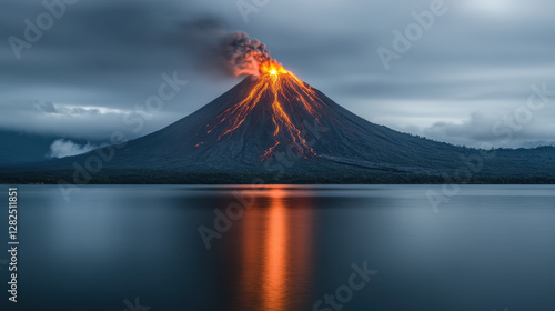 Fototapeta premium Majestic Erupting Volcano with Vibrant Lava Flow at Dusk