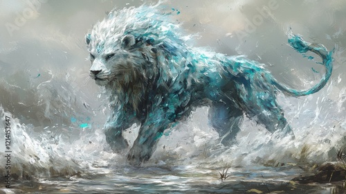 © wiwat apisithpinyo, Obraz premium Majestic Ethereal Lion Roaming Through Misty Ocean Waves