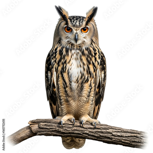 Naklejka premium Majestic eurasian eagle owl perched on a branch against a black background