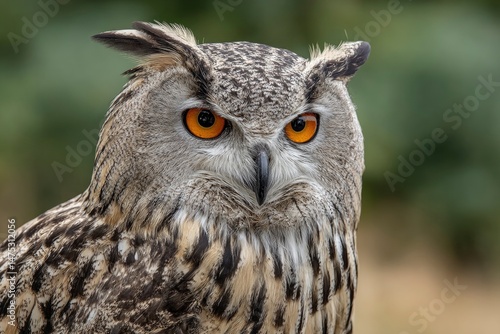 © AYESKIA, Naklejka premium Majestic Eurasian Eagle Owl Portrait: A Serene Wildlife Close-up
