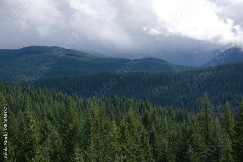 © Derrick, Fototapeta premium Majestic Evergreen Forest Under Cloudy Sky in Mountainous Terrain