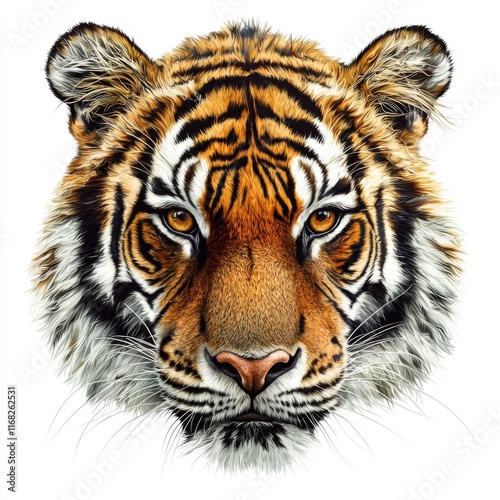 © Pornnapha, Fototapeta premium Majestic Face of a Tiger with Striking Orange and Black Stripes Against a White Background