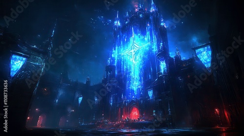 Obraz premium Majestic fantasy castle enchanted forest digital art nighttime aerial view...