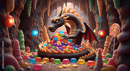 Naklejka premium Majestic fantasy dragon guarding a treasure hoard of colorful candies and lollipops in a whimsical cave setting