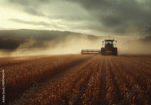 Fototapeta premium Majestic Farming Landscape at Dusk with a Powerful Tractor Harvesting Golden Crops under Dramatic Clouds and Soft Dust in the Air