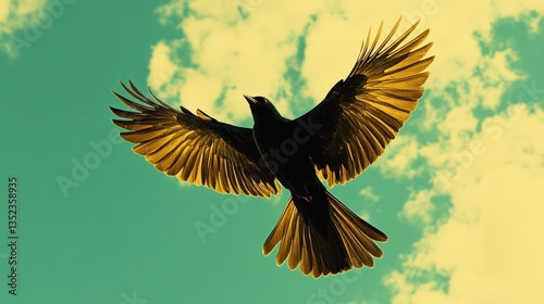 © Af, Naklejka premium Majestic Flight: A Raven Soaring Through a Cloudy Sky