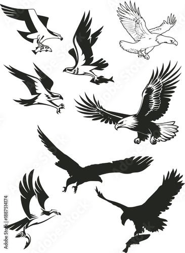 © Sohab, Fototapeta premium Majestic Flying Eagle Silhouettes and Predatory Hawk Vector Art