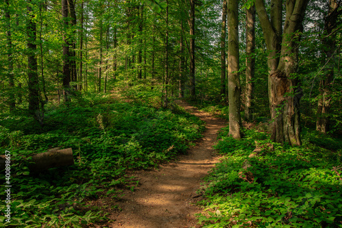 © Artem Kniaz, Fototapeta premium majestic forest idyllic nature environment space scenic view of green foliage everywhere and dirt trail touristic path way through beautiful place
