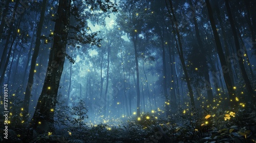 Obraz premium Majestic forest illuminated by fireflies during a mystical twilight hour in a...