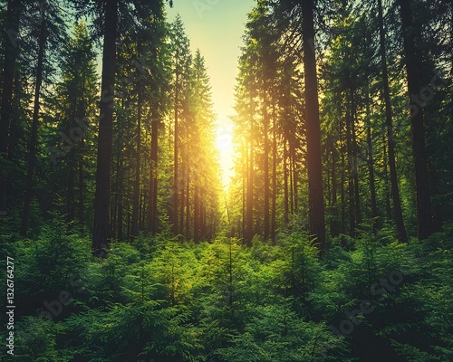 © Bussakon, Fototapeta premium Majestic Forest of Towering Sequoia Trees with Lush Undergrowth and Glowing Sunlight