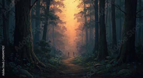 © IbragimovN, Naklejka premium Majestic forest path at sunset with silhouettes of two deer