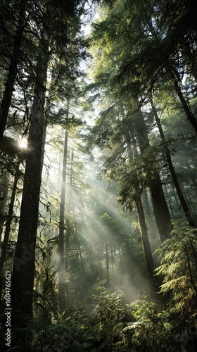 Obraz premium Majestic forest scene featuring sunlight streaming through tall green trees and mist