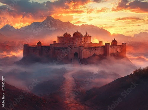 © Mariya, Fototapeta premium Majestic Fortress Path to Ancient City Civilization Ruins at Sunset in Desert Mountains