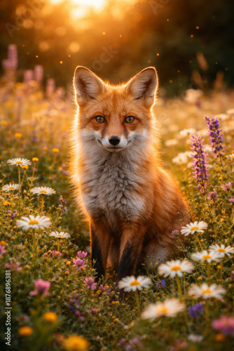 © thodonal, Fototapeta premium Majestic fox sitting in a vibrant flower field at sunset