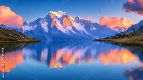 Fototapeta premium Majestic French alps landscape of Lac Blanc with Mont Blanc mountain range reflected on lake in the sunset at Haute Savoie Chamonix France : Generative AI