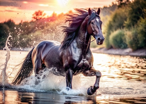 © prapatsorn, Fototapeta premium Majestic Friesian Horse Galloping Through Splashes of Water in Nature's Beauty