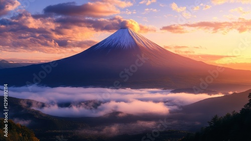 Fototapeta premium Majestic Fuji Sunset Mountain, Clouds, Japan, Autumnal Colors, Travel