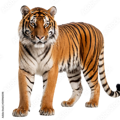 © trend today, Naklejka premium Majestic Full-Body Tiger Portrait with Striking Stripes, Piercing Yellow Eyes, Powerful Stance, Detailed Fur, High Contrast, Studio Lighting, White Background, Realistic 4K Wildlife PNG