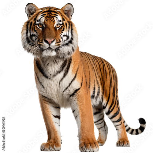© trend today, Naklejka premium Majestic Full-Body Tiger Portrait with Striking Stripes, Piercing Yellow Eyes, Powerful Stance, Detailed Fur, High Contrast, Studio Lighting, White Background, Realistic 4K Wildlife PNG