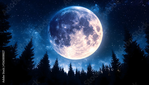 Naklejka premium Majestic full moon illuminating a dark evergreen forest at night