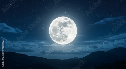 © Nur Khalalli, Fototapeta premium Majestic Full Moon Over Mountain Silhouette, Starry Night Sky.