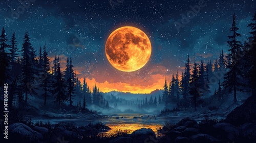 © Get it, Naklejka premium Majestic full moon rising over a tranquil forest landscape at dusk
