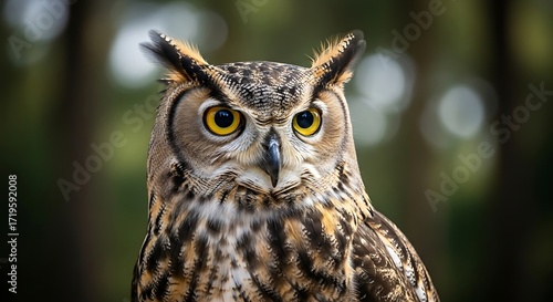 © Irvanuddin, Fototapeta premium Majestic gaze of an Eurasian eagle-owl amidst forest tranquility