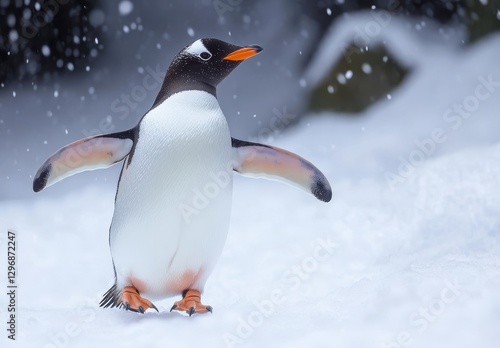 © ANUAR, Naklejka premium Majestic Gentoo Penguin Standing on Snowy Background with Fluffy Snowflakes Falling Gracefully in a Cold Antarctic Environment
