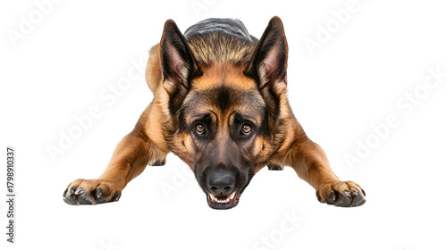 © Subir, Obraz premium Majestic german shepherd lowering body stance isolated on transparent background
