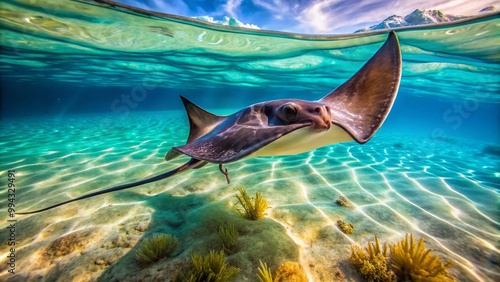 © Danicha, Obraz premium Majestic Giant Freshwater Stingray Gliding Gracefully Through Clear Tropical Waters in Nature
