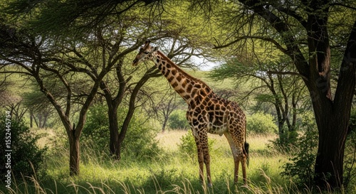 Naklejka premium Majestic Giraffe Stands Tall Among Trees in African Savanna Wildlife Scene