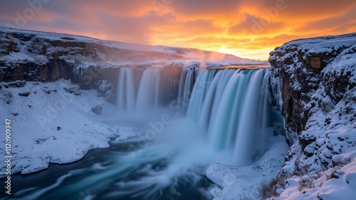 Fototapeta premium Majestic Goðafoss Waterfall in Winter, Icelandic Golden Hour Landscape Photography