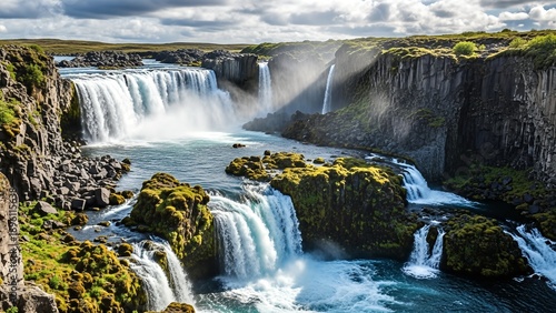 © Joos, Obraz premium Majestic Godafoss Waterfall in Iceland with Lush Greenery and Dramatic Clouds.