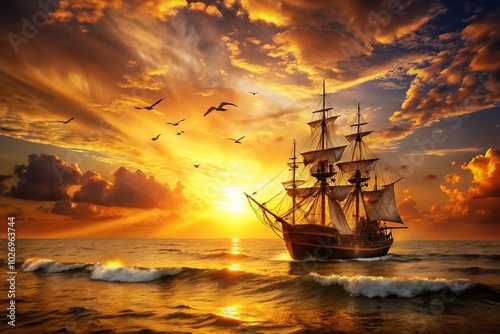 Obraz premium Majestic Gold Pirate Ship Sailing the Open Seas at Sunset