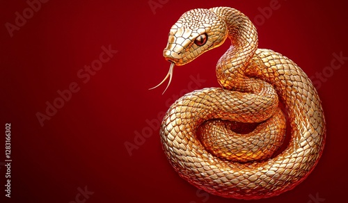 Fototapeta premium Majestic gold snake coiled on vibrant red. Hyper-realistic, luminous, and elegant. Ideal for Chinese New Year 'Year of the Snake' designs. Copy space available.