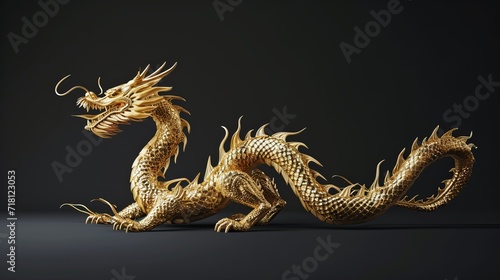 © Rika, Obraz premium Majestic Golden Dragon, Intricate Details on Black Background, Generative AI