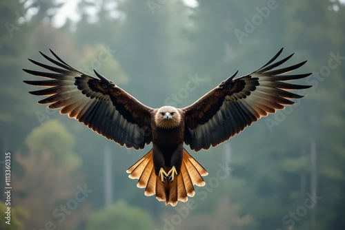 © Siwapong, Fototapeta premium Majestic Golden Eagle in Flight Over Lush Forest