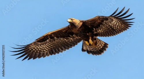 © phj.domingos, Fototapeta premium Majestic Golden Eagle Soaring Gracefully Through a Clear Blue Sky with Wings Fully Extended Displaying its Magnificent Plumage and Powerful Form