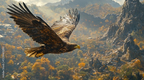 © PANINN 369, Fototapeta premium Majestic Golden Eagle Soaring Over Rugged Mountains and Vibrant Autumn Landscape