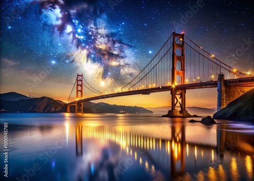 © Adisorn, Naklejka premium Majestic Golden Gate Bridge Illuminated at Night with Night Sky and Reflections in the Water