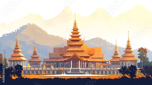 © Woranuch, Naklejka premium Majestic Golden Palace in Mountainous Landscape.