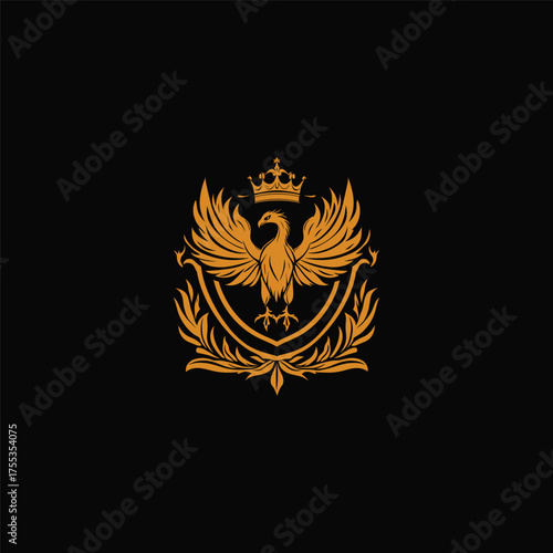 © Seraphyn, Fototapeta premium Majestic golden Phoenix bird heraldic crest logo crowned with a royal crown and resting on a shield