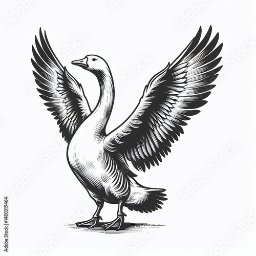 Obraz premium Majestic Goose Black and White Engraved Illustration with Wings Spread