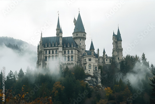 © Tauhidul, Fototapeta premium Majestic gothic castle shrouded in atmospheric mist on a forested mountainside.