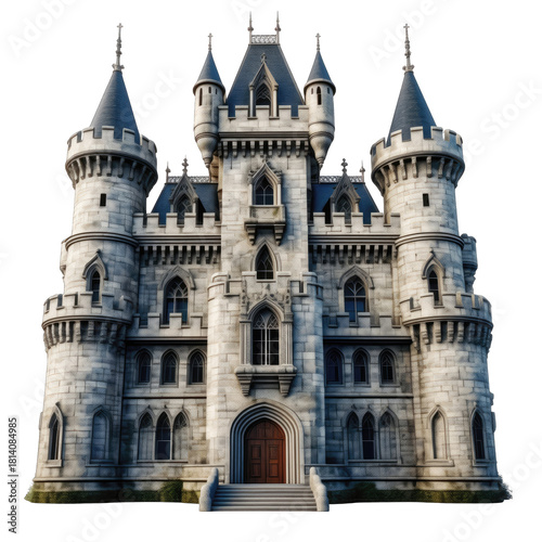 © Bangkit, Obraz premium Majestic Gothic Castle With Intricate Stone Architecture And Tall Towers Isolated On Transparent Background