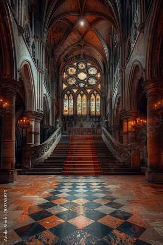 Fototapeta premium Majestic Gothic Cathedral Interior with Grand Staircase and Stained Glass...