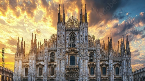 © Kitta Studio, Fototapeta premium Majestic Gothic Cathedral Under Vibrant Sunset Sky in Milan