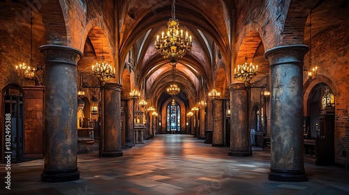Fototapeta premium Majestic Gothic Church Interior, Empty Hallway, Vintage Chandeliers,...