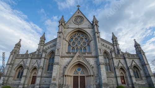 © wiwat apisithpinyo, Fototapeta premium Majestic Gothic Church with Intricate Stained Glass Windows Under a Dramatic Sky